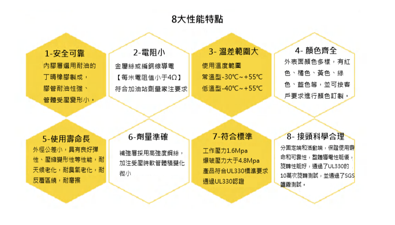 奕馨銷售之加油機用(油氣回收型/柴油型)加油槍管 符合美國 UL 330 標準規範,適用於動力車輛、船舶等加油機之連接配管,以及加油槍專用配管。